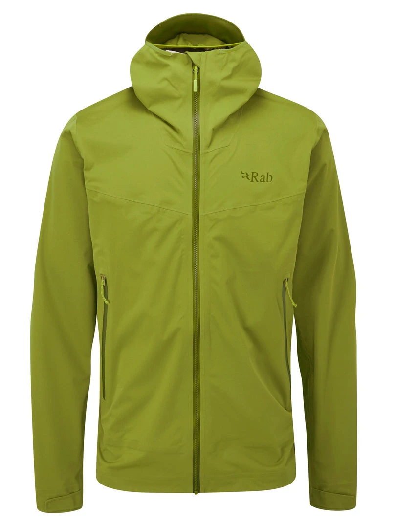 A game-changing jacket from Rab that can serve equally well as a softshell or a soft hardshell jacket. Feels like a softshell, performs like a hardshell. This multi-functional layering piece feels surprisingly much softer than the vast majority of rain jackets, and does not have that “crinkly” and “boardy” feel that most people have come to expect from a waterproof 3-layer rain shell. The fabric also includes some stretch, is at the upper end of breathability as far as waterproof/breathable jackets go, and is comprised of a high performance polyurethane membrane laminated between two high gauge knit fabrics where the outer fabric is treated for water repellency and the inner fabric is designed to wick and help move moisture quickly through and out of the jacket. Rab hopes that this piece will transform the way you dress for the mountains.