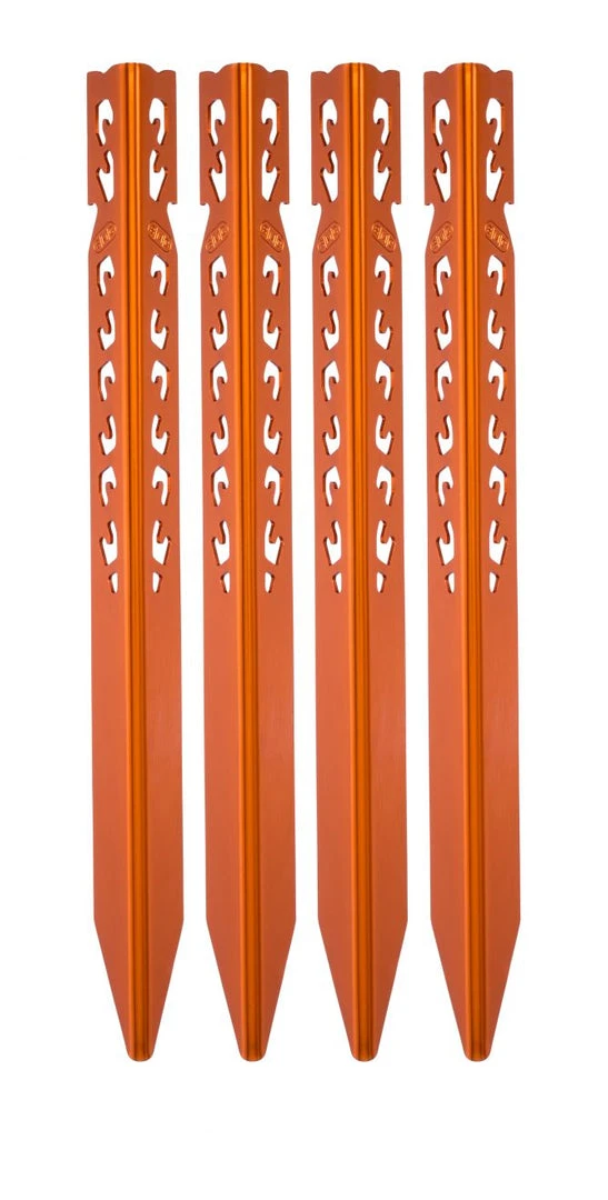 Perforated V-shaped anodized aluminum Mountaineering Tent Stakes from SMC. Designed for use in soil, sand, and snow. Numerous cutouts provide attachment point options and reduce weight while maintaining surface area for holding power. Set of 4.